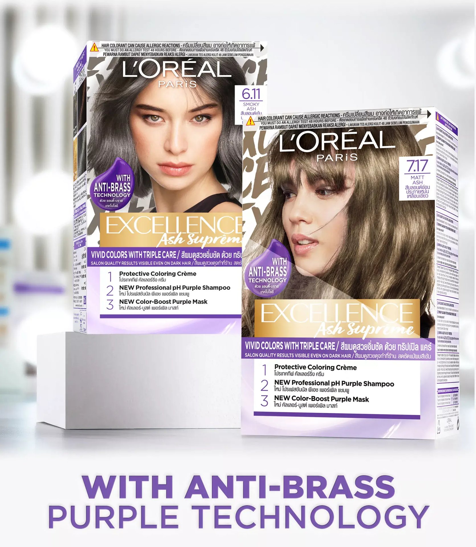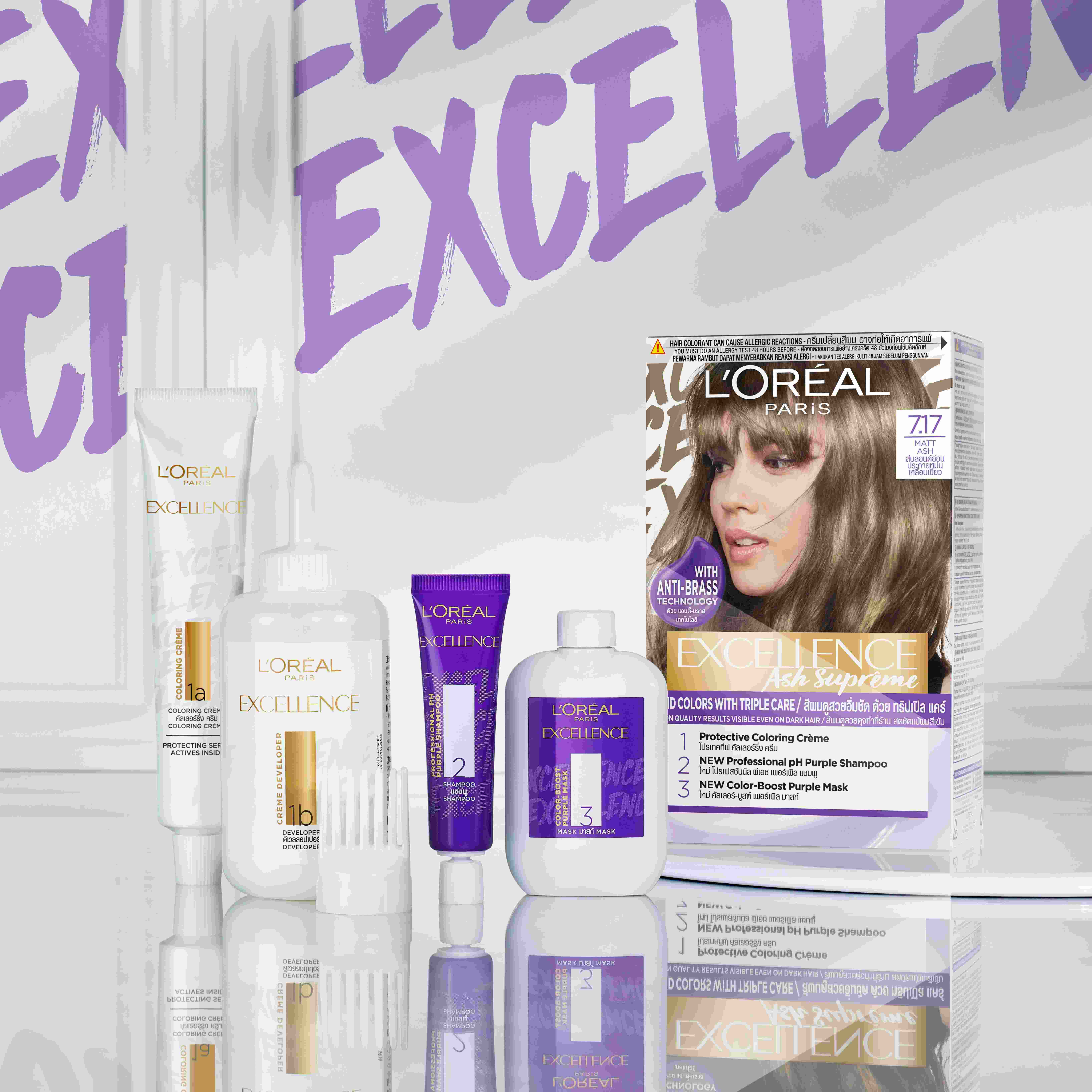 L'Oreal Paris Excellence Ash Supreme Hair Color with Anti-Brass Purple Shampoo: Embrace supreme ash tones and banish brassiness. Provides vibrant, long-lasting ash shades while neutralizing unwanted yellow/warm tones for a cooler, more refined look.